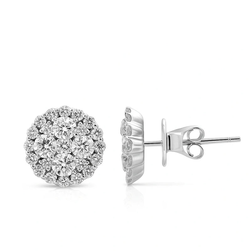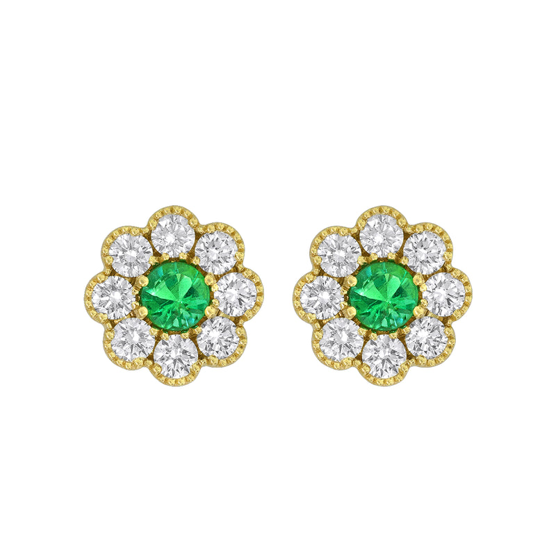 18K Yellow Gold Emarld & Diamond Floral Stud Earrings