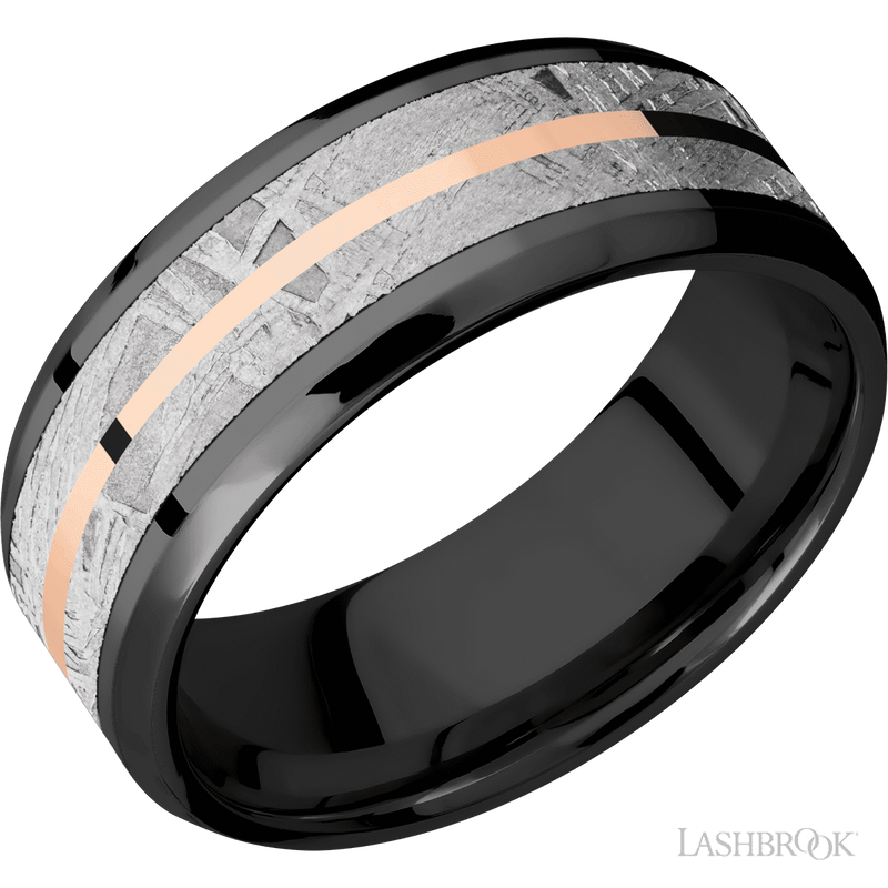 8mm Ziconium Flat Band with 5mm Meteorite and 1mm 14k Rose Gold Inlays