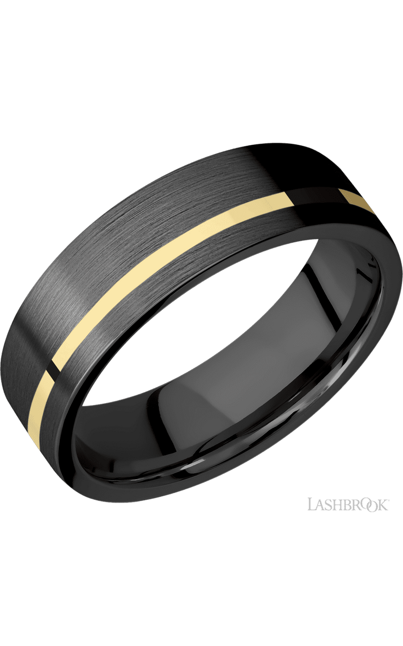 7 mm wide/Flat/Zirconium band with one 1 mm Off Center inlay of 14K Yellow Gold.