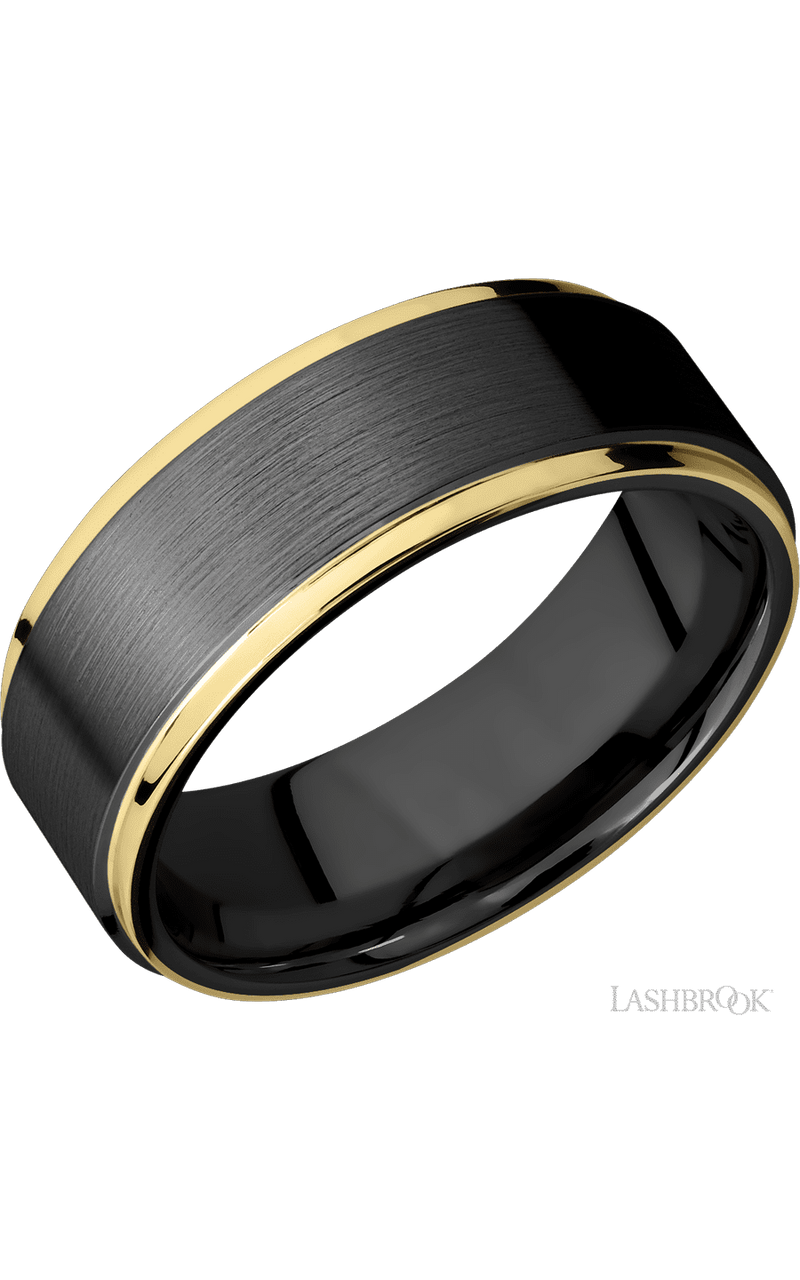 8 mm wide/Beveled/Zirconium band with two 1 mm Edge inlays of 14K Yellow Gold.