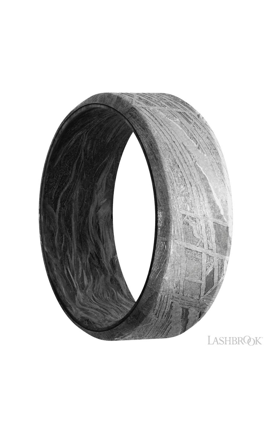 8 mm wide Beveled Meteorite band featuring a Forged Carbon Fiber sleeve.