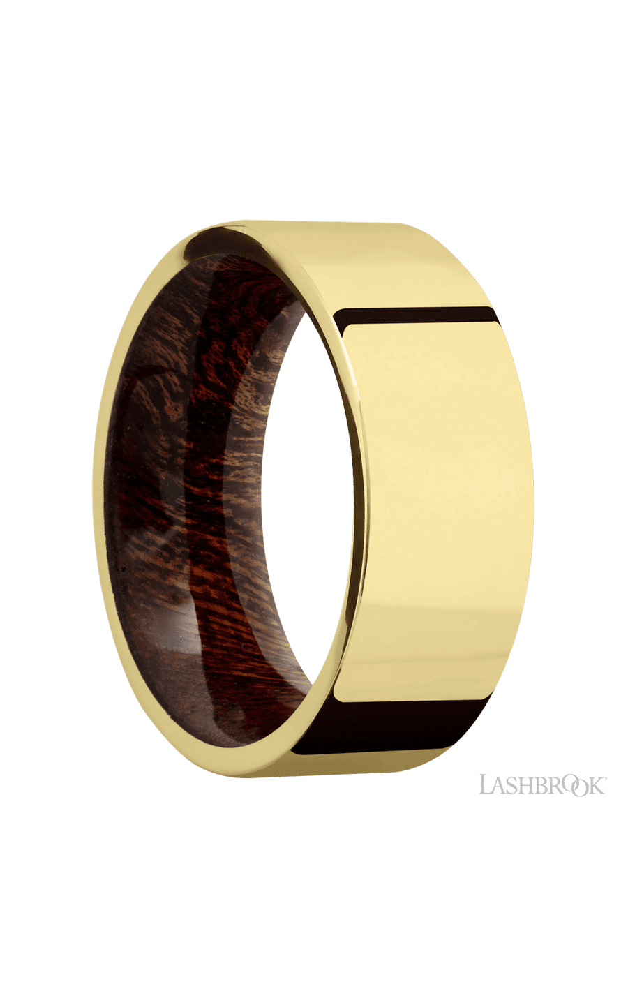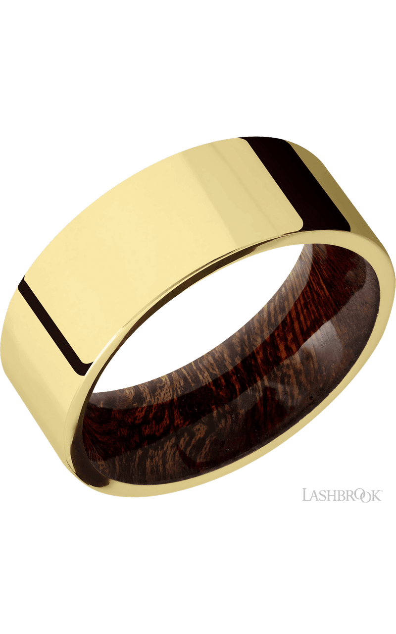 8 mm wide Flat 14K Yellow Gold band featuring a Sapele sleeve.