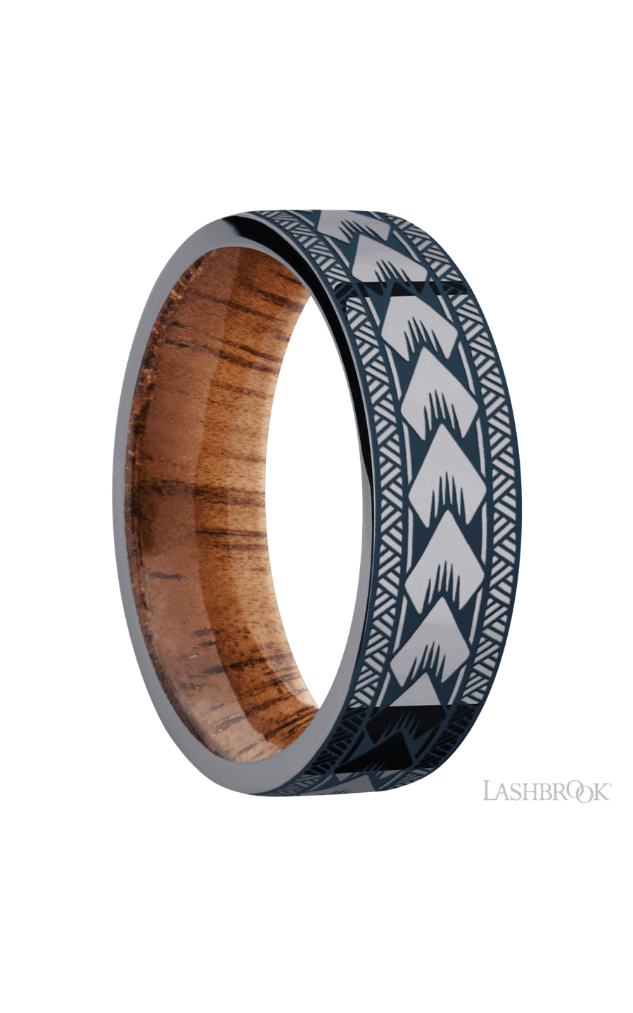 7 mm wide/Flat/Tantalum band with a laser carved Maori pattern also featuring a Koa sleeve.