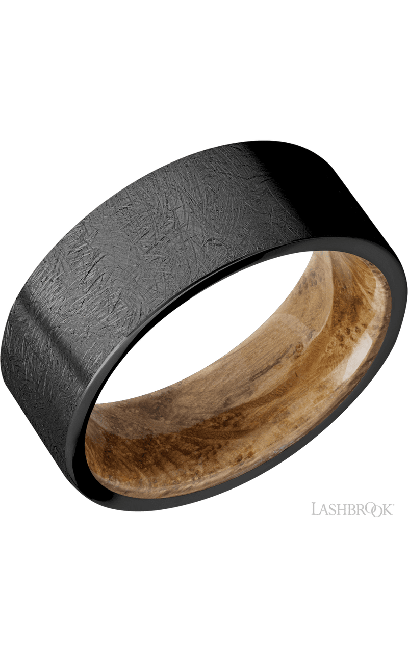 8 mm wide Flat Zirconium band featuring a Whiskey Barrel sleeve.