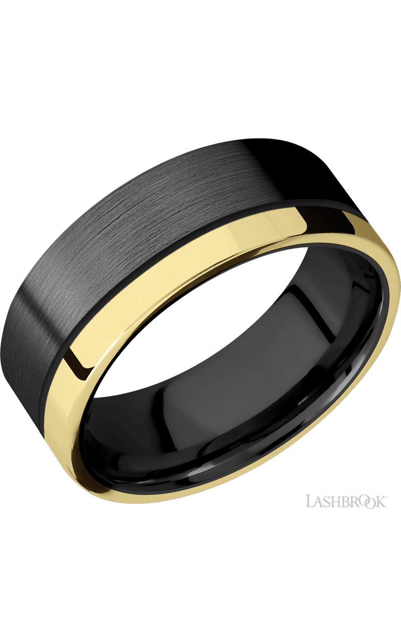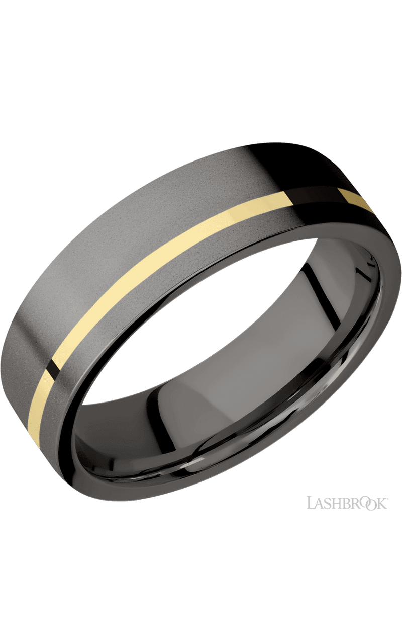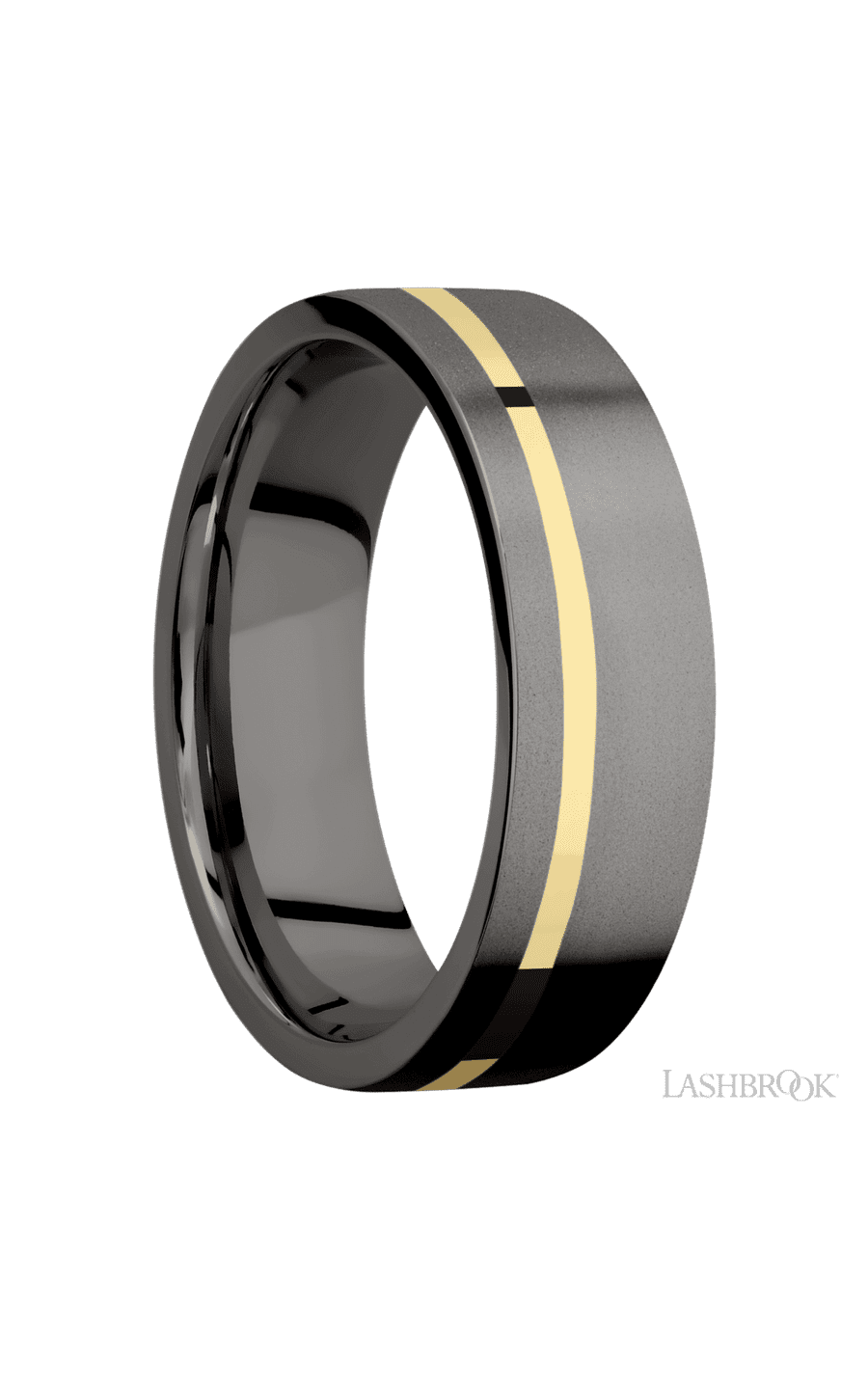 8 mm wide/Flat/Zirconium band with one 2 mm Off Center Edge inlay of 14K Yellow Gold.