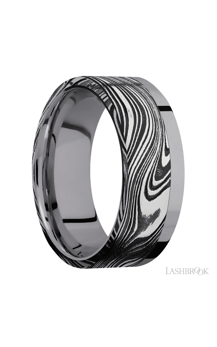 8 mm wide/Flat/Tantalum band with a laser carved Mountain 2 pattern.