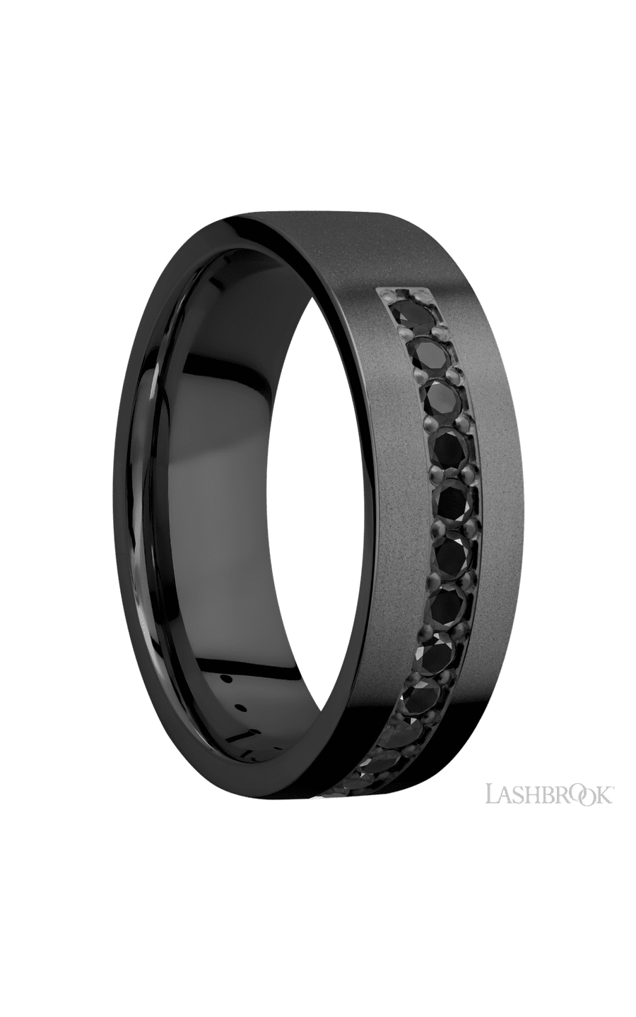 7 mm wide/Domed Bevel/Zirconium band with a 6X Even arrangement of .07 carat Round Diamond stones in a Flush setting.