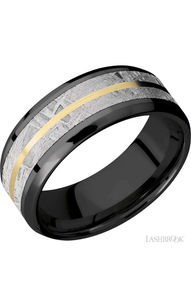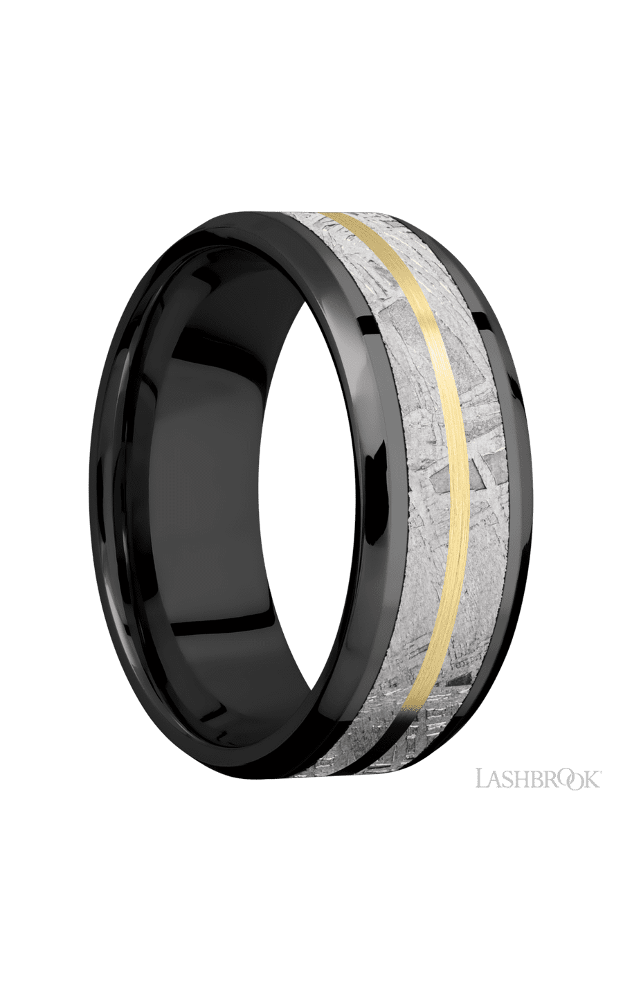 8 mm wide/Beveled/Zirconium band featuring inlays of Meteorite and 14K Yellow Gold.