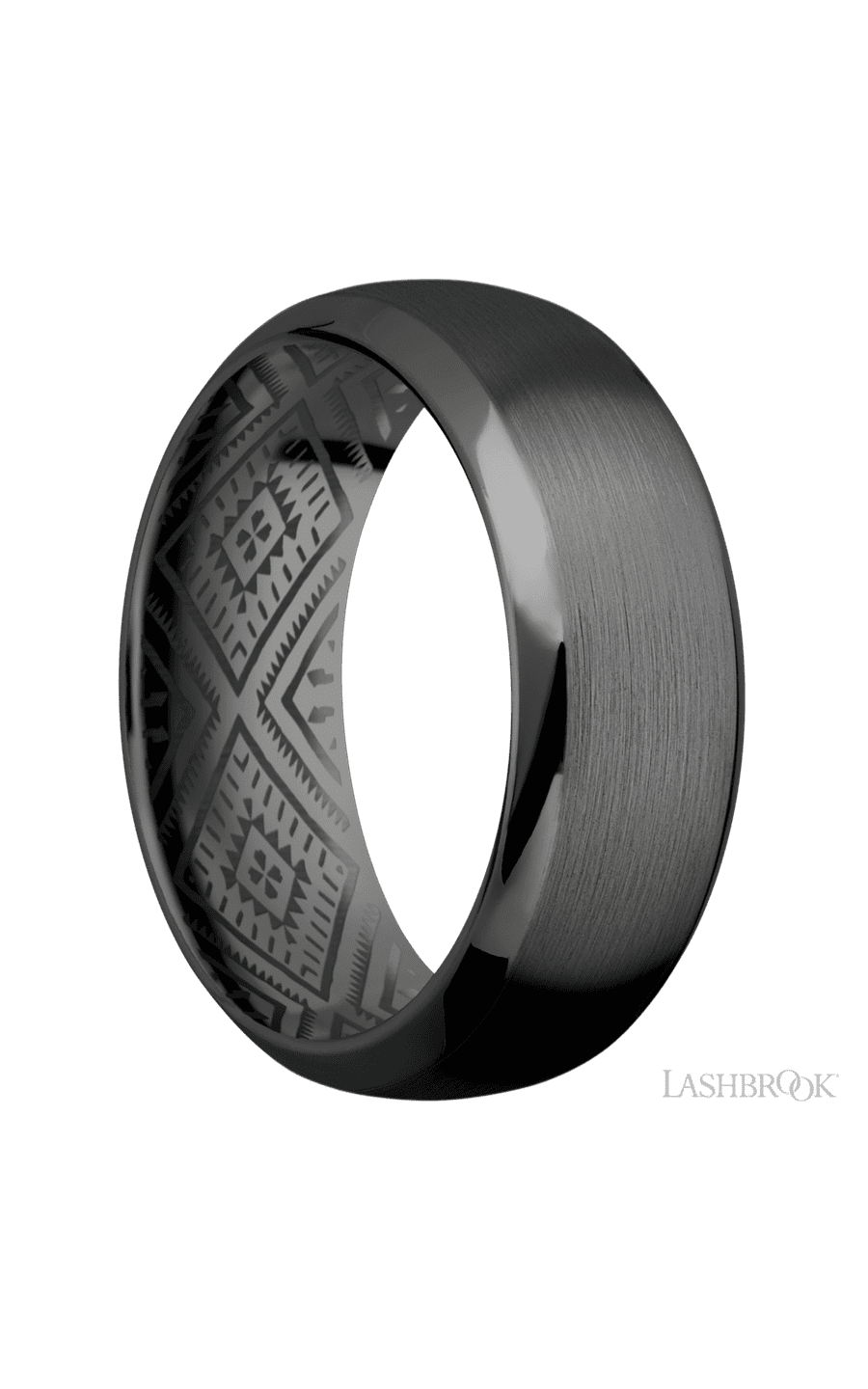 8 mm wide/Domed/Cobalt Chrome band with one 6 mm Centered inlay of Zirconium with a laser carved Escher 1 pattern.