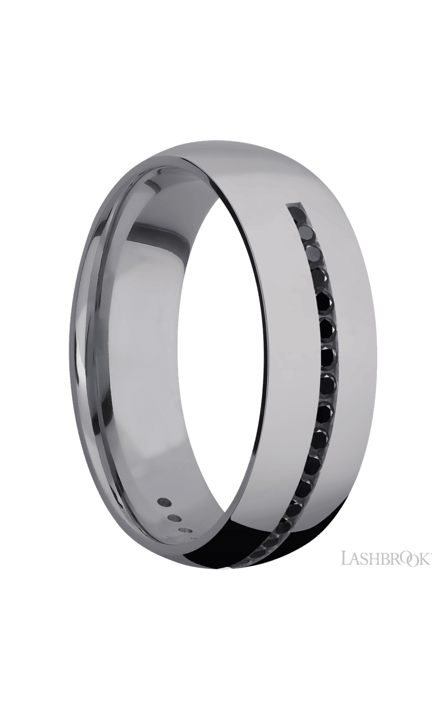 7 mm wide/Domed/Tantalum band with a Half Eternity arrangement of .015 carat Round Black Diamond stones in a Channel setting.