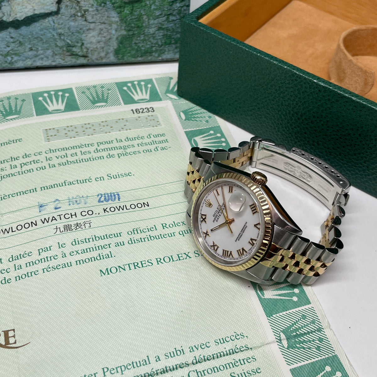 Pre-owned Rolex 16233 Datejust White Roman Numeral Dial Two Tone Year 2001 36mm Cal. 3135