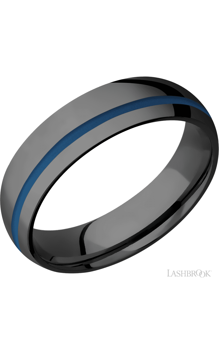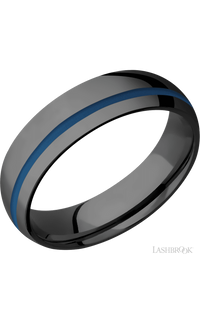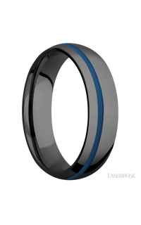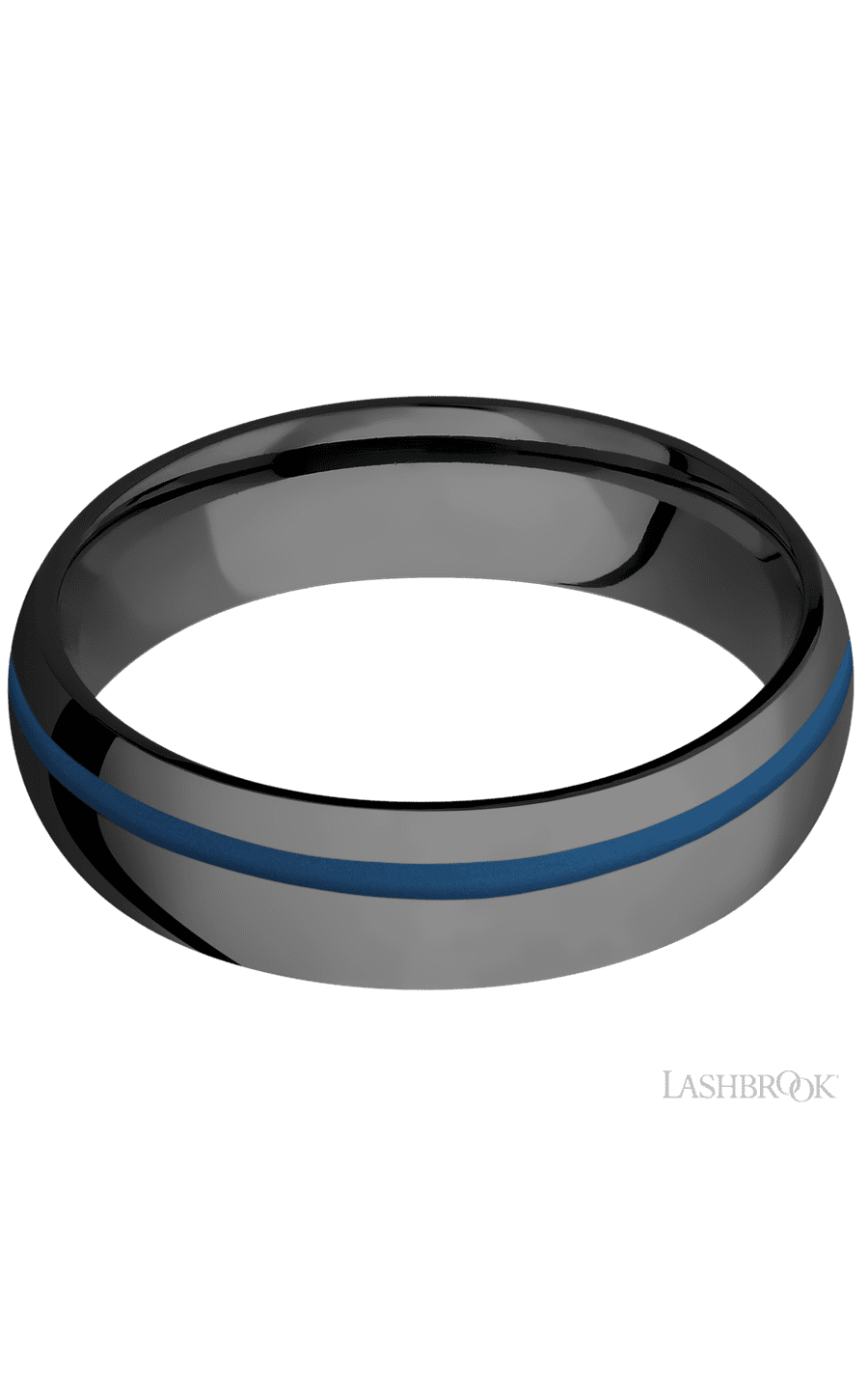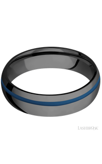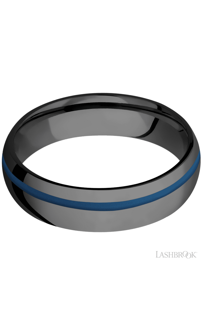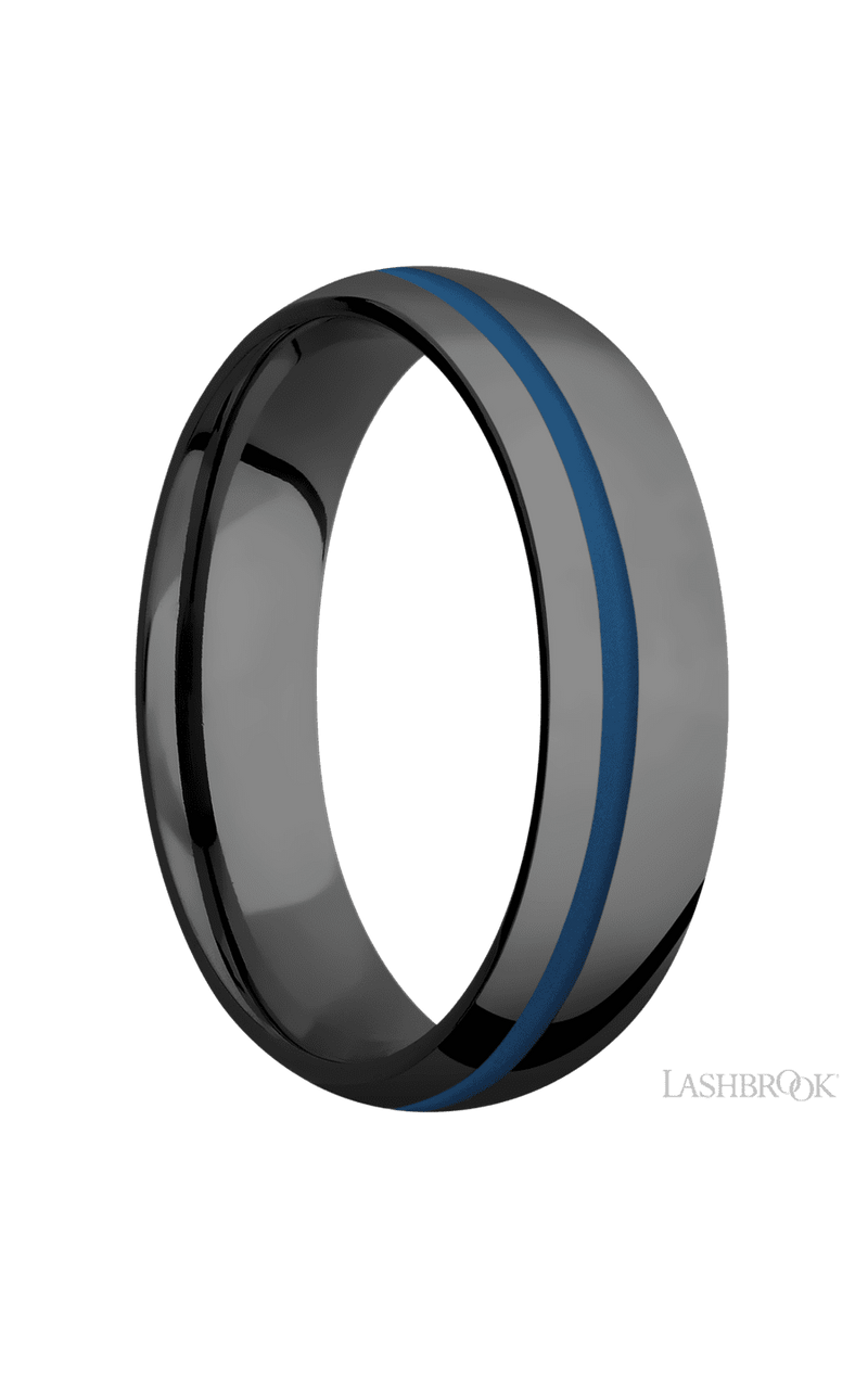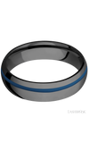 6 mm wide/Domed/Zirconium band with one 1 mm Off Center inlay of Ridgeway Blue.