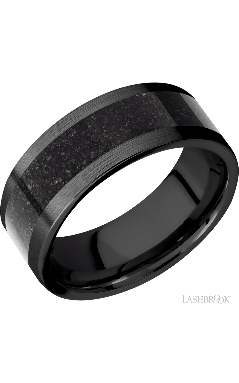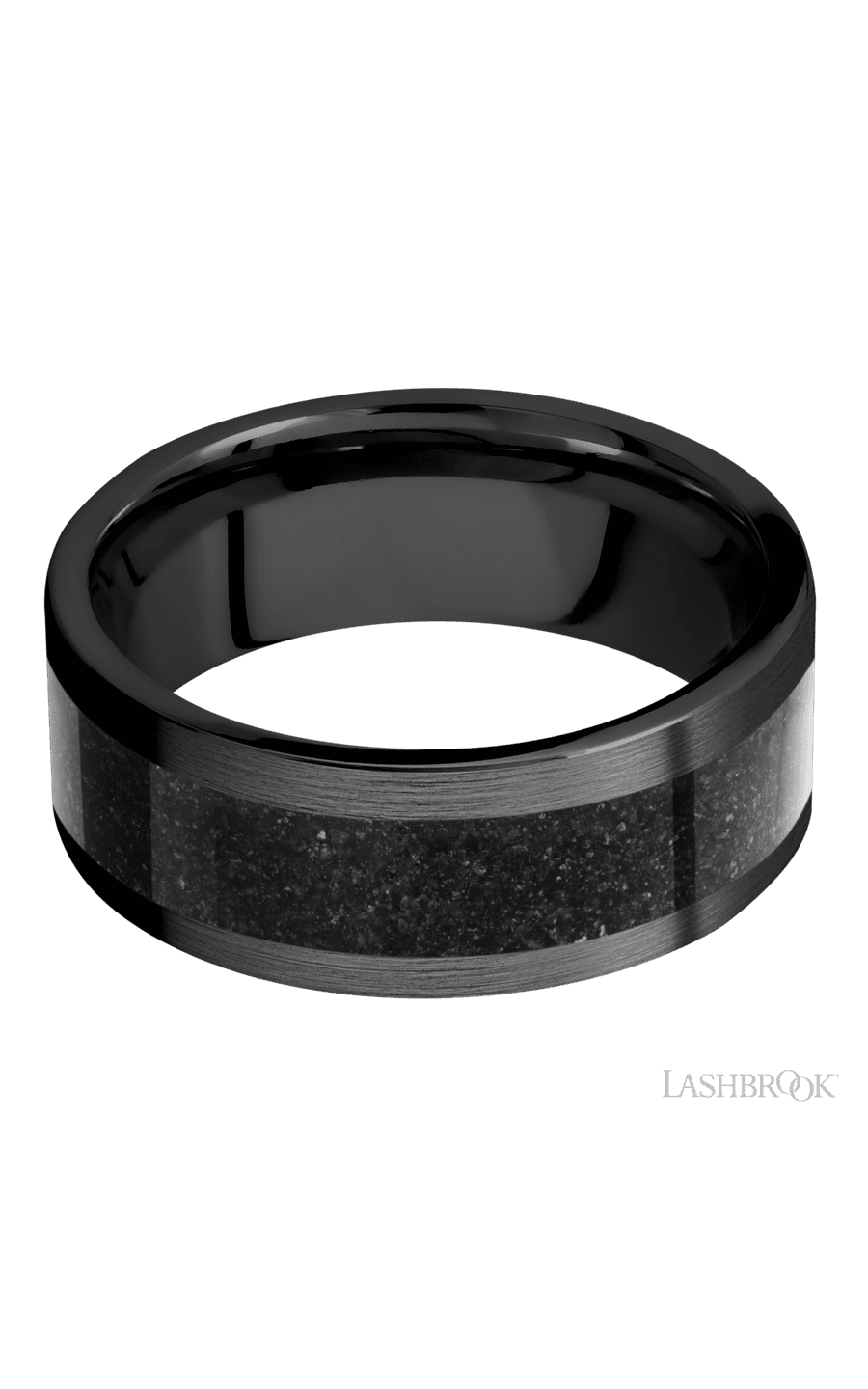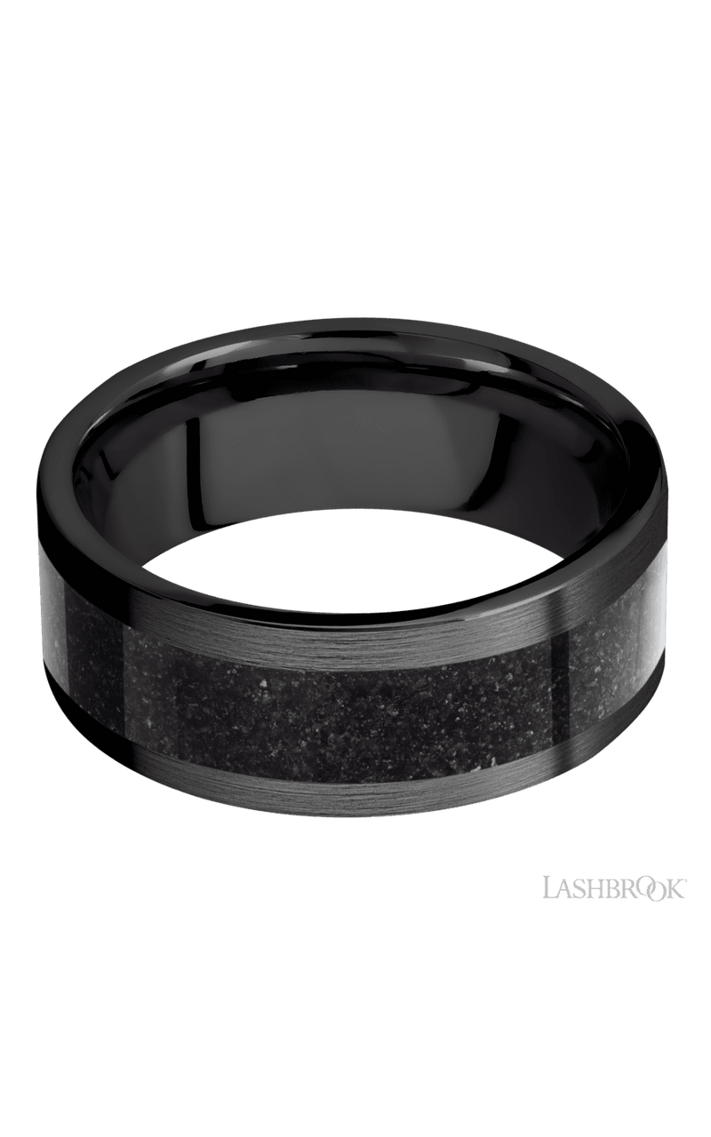8 mm wide/Flat/Zirconium band with one 5 mm Centered inlay of Dinosaur Bone Black.