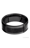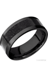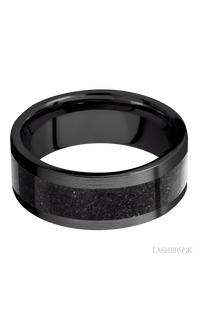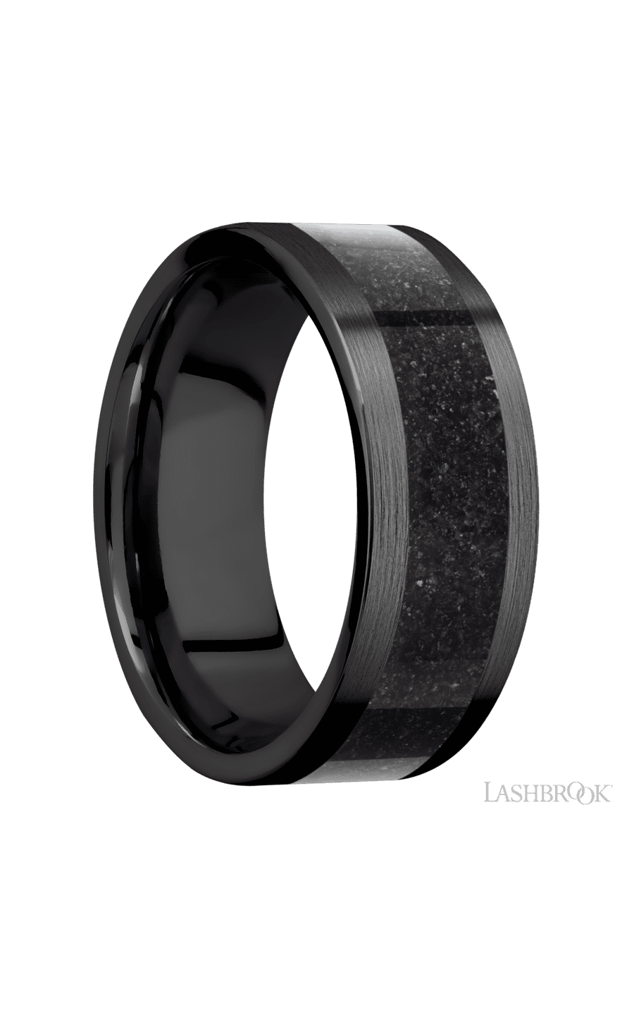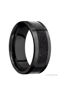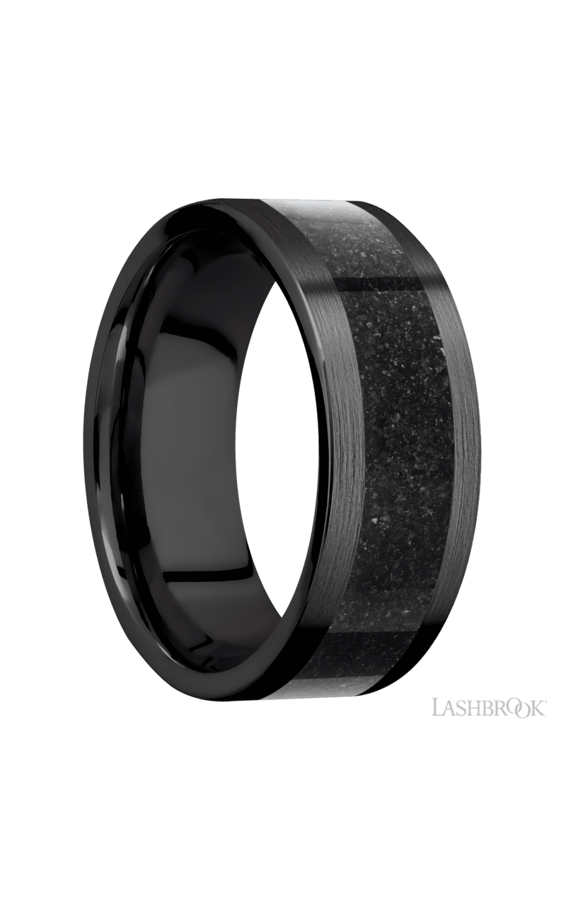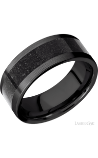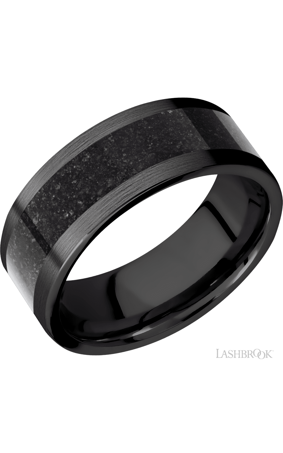 8 mm wide/Flat/Zirconium band with one 5 mm Centered inlay of Dinosaur Bone Black.