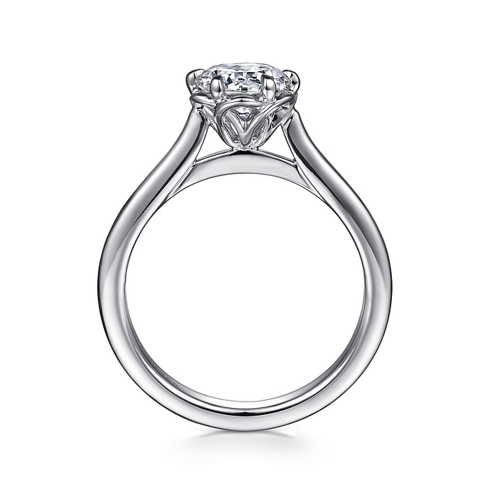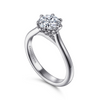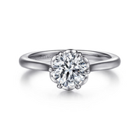 Created in the storied tradition of round solitaire engagement rings, this style features the added twist of a subtle floral inspiration. Prongs securing your 1ct round center stone evoke a lovely blossom. A polished, cathedral style 14K white gold shank completes this radiant ring.